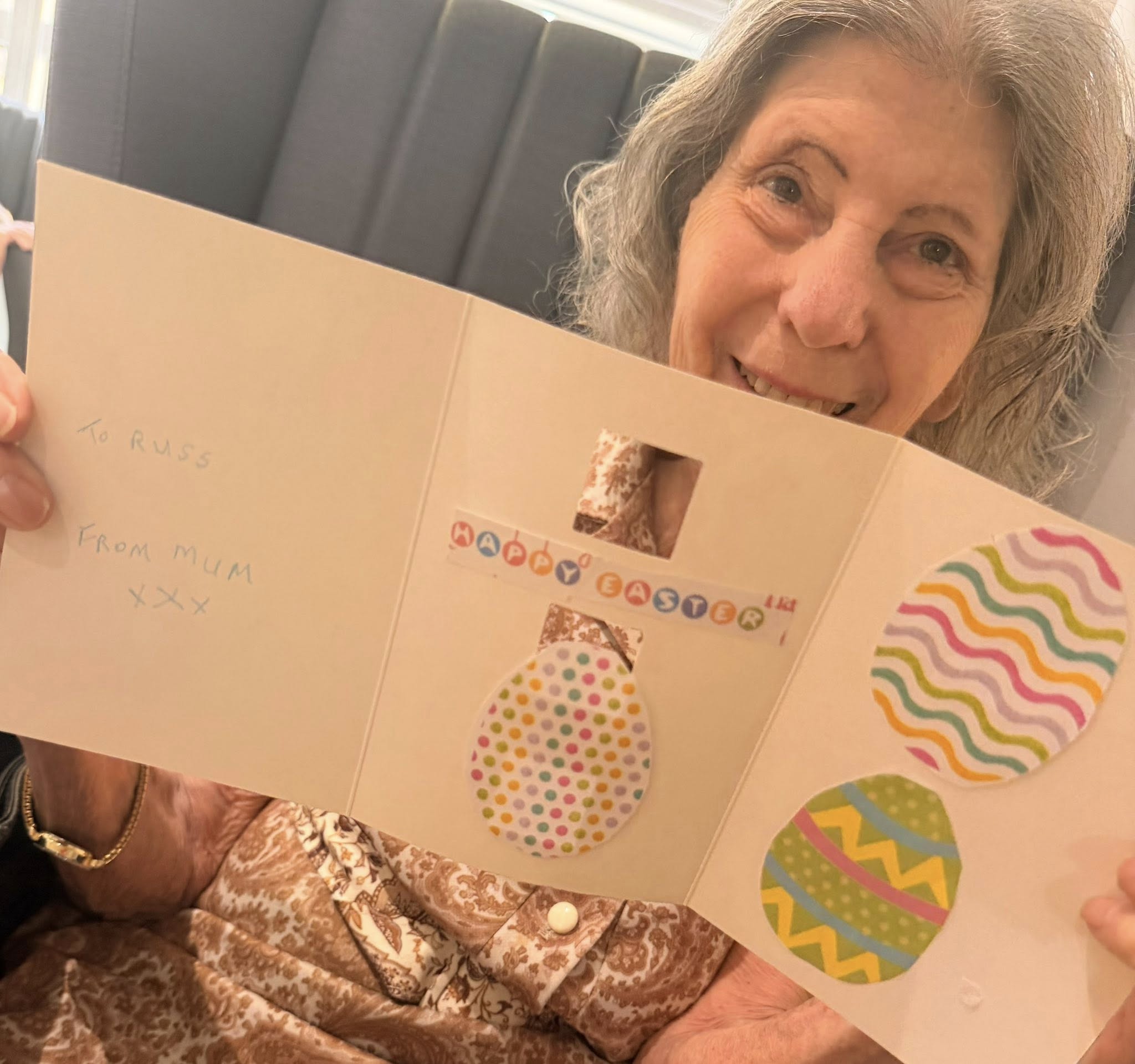 Norah has made her easter card to deliver to her son, whom she is immensely proud of and loves to tell stories about his life.